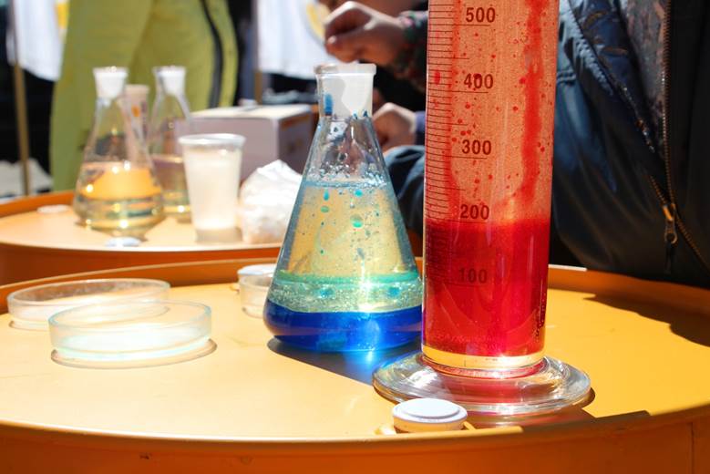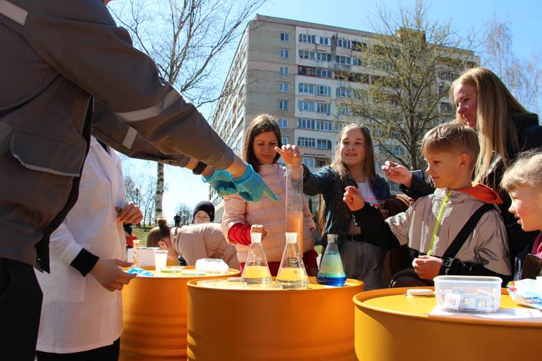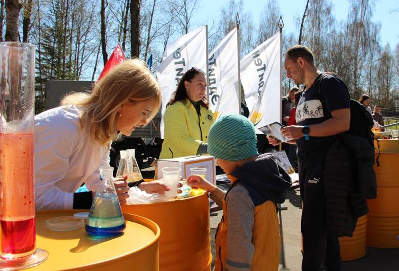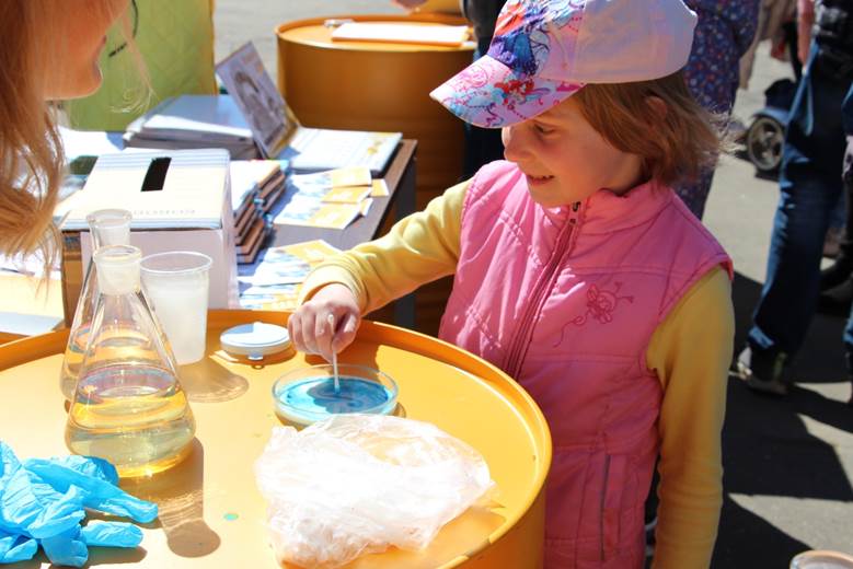 На желтых бочках разместились колбы-капли с образцами продукции нашего Общества и мини лаборатория, где сотрудники Общества лаборант Виолетта Харланова и инженер-технолог Владислав Юкович при помощи всем хорошо известных простых продуктов - молока и пищевых красителей демонстрировали принцип действия наших присадок. Посетителей увлекало наблюдение за тем, как от капли присадки цветные пятна на поверхности молока растворялись.